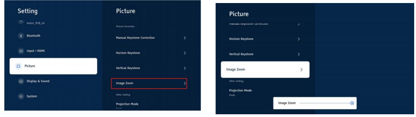 Go to the Picture Setting-Zoom Setting, the “OK” button to go to the Zoom page, use the and buttons on the remote control to zoom in or out from 100%-50%.