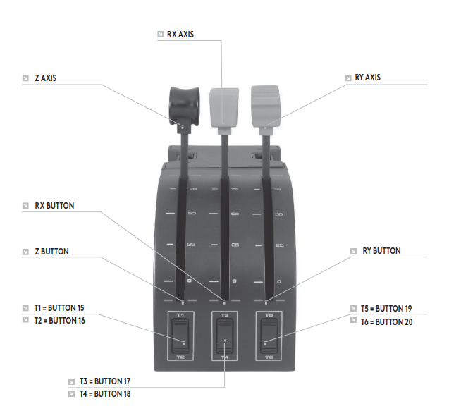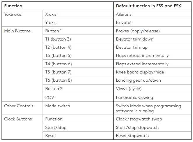 The Pro Yoke System’s buttons, controls, and axes correspond to commonly used functions in Microsoft FS9 and FSX according to the tables below. As with any software, if you wish to change the function of a button or control, you will need to change the settings of the game software.