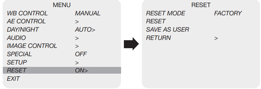 - RESET MODE: Select the desired setting mode. Select from USER or FACTORY using the LEFT or RIGHT button.