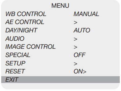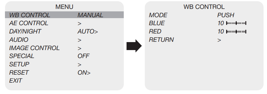 Select WB CONTROL using the UP or DOWN button. You can change between AUTO, ATW, PUSH, and MANUAL using the LEFT or RIGHT button.