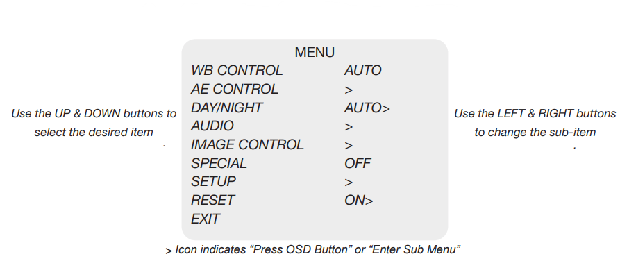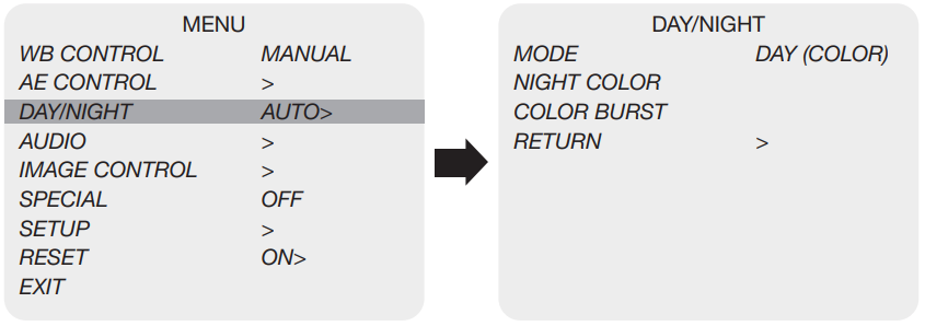 Select DAY / NIGHT using the UP or DOWN button. You can select one sub-mode from AUTO, COLOR, and NIGHT using the UP or DOWN button.