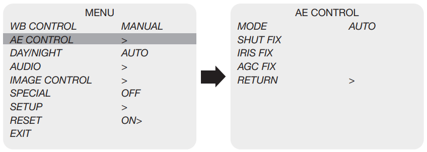 Select AE CONTROL using the UP or DOWN button. You can select one sub-mode using the UP or DOWN button.