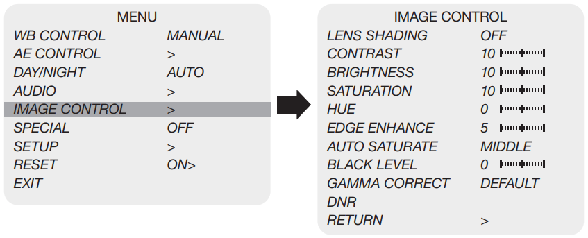 Select IMAGE CONTROL using the UP or DOWN button. You can select LENS SHADING, CONTRAST, HUE, and EDGE ENHANCE using the UP or DOWN button.