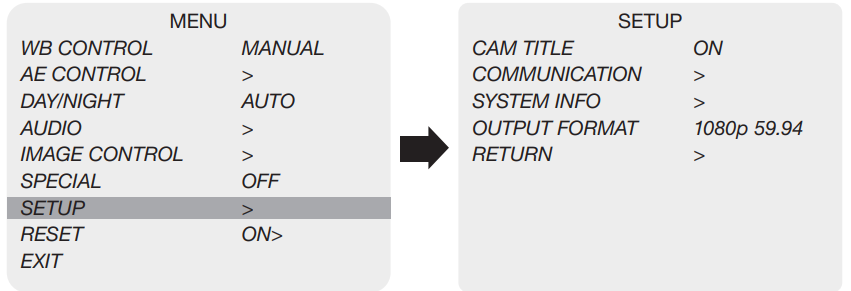 - OUTPUT FORMAT: Camera resolution and frame rate can be set (1080 by default). Select the FRAME RATE using the LEFT or RIGHT button.