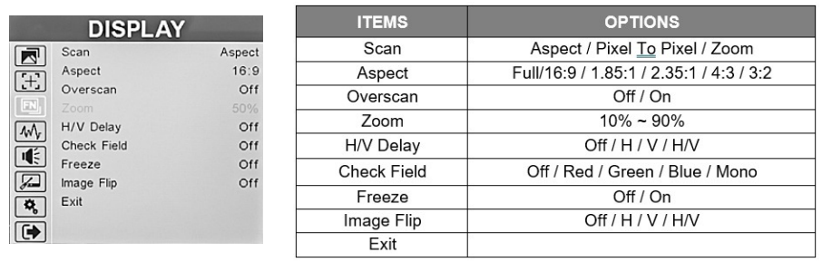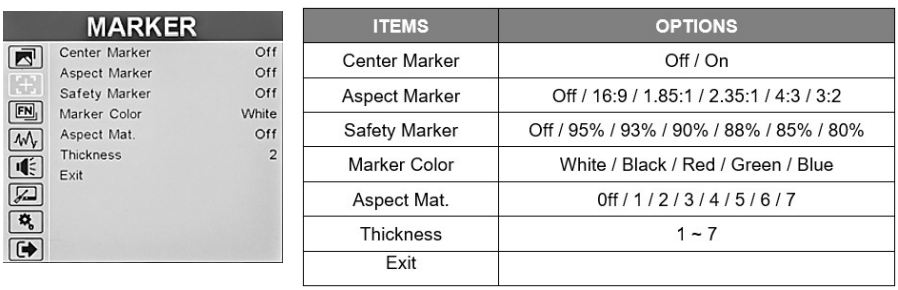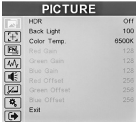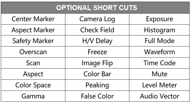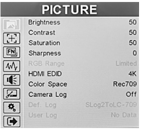 The function key menu will appear on the right side of the screen. Simply rotate the Menu knob to the desired function shortcutand press the Menu knob to make the selection. Marshall-V-702W-12G-V2-Rack-Mount-Monitor-Figure-23