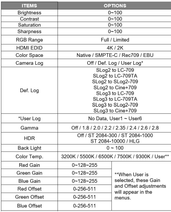 • Default (preset) Log modes. When viewing material from a camera that has a Log gamma curve applied, the pictures will not appear normal unless the matching Log mode is selected.
