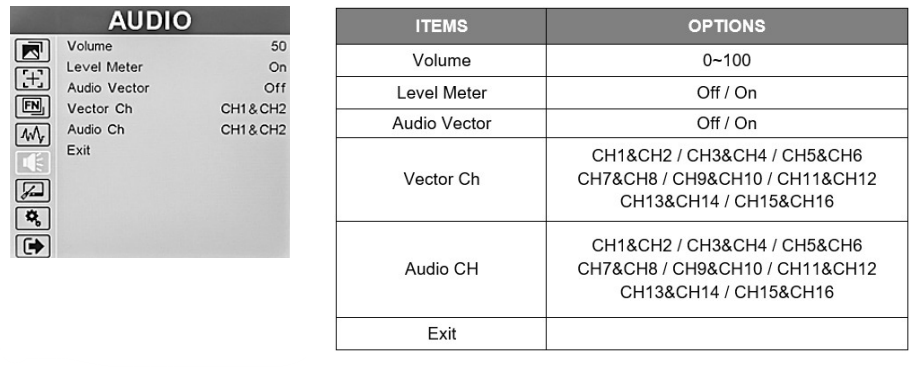 • HDMI input and loop out. Embedded audio may be monitored at the Headphone jack and visually monitored on-screen.