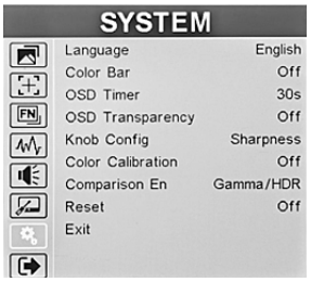 • To reset the monitor, access the “SYSTEM” menu page, press the Menu knob, then rotate left or right to select “Reset”. Press the knob once, then rotate the knob to cause the unit to reset.