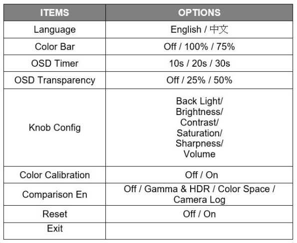 Press the MENU knob on the monitor, and the function menus will pop up on the screen. Rotate left or right to select an option. Then press the knob again to open the sub-menu. When an arrow pointer appears in the menu, turn the Menu knob again to access the item or to confirm a selection.