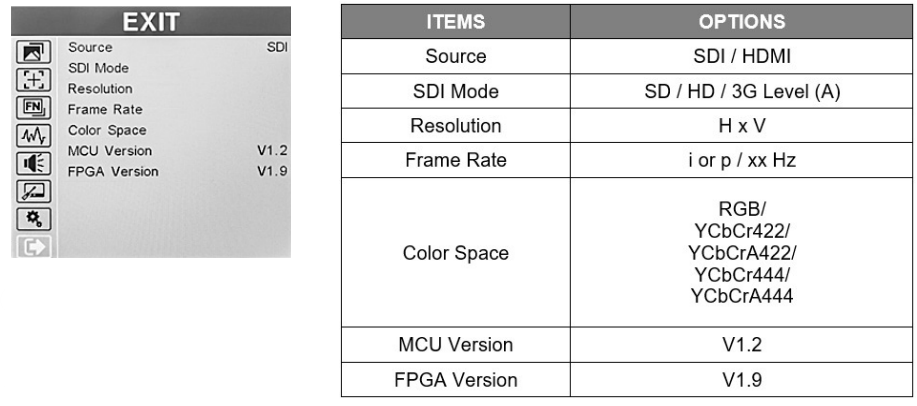 The EXIT page displays the current state of the monitor. There are no selections on this page. Pressing the Menu Knob closes the menu screen.