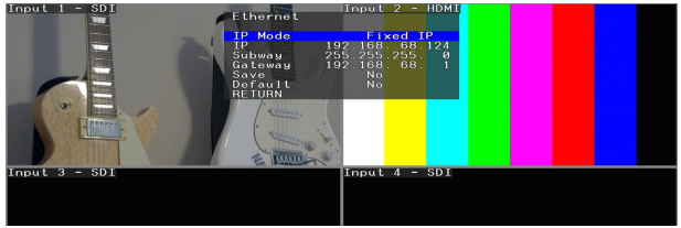 System setup is available through front panel controls. The menus are displayed via the Quad View HDMI output. The hand-held IR remote can be used to access this same menu system and select video inputs. Setup and control are also available via a Web Browser (Microsoft Edge has the best compatibility). The front panel OSD (on-screen display) method is a great place to start with initial setup and system check, as it does not require configuring an Ethernet connection first.