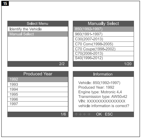 Select Manual Select. All supported systems are shown on the display. Select the system to be tested. Select the year of manufacture for the vehicle and press the OK button to go to the selected menu.