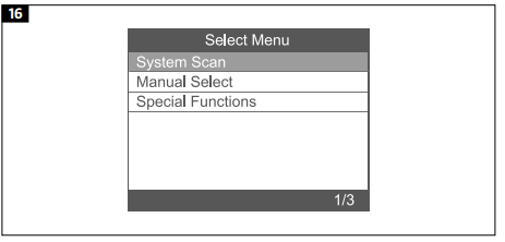 On this display, there are the options System Scan, Manual Selection, and Special Functions.