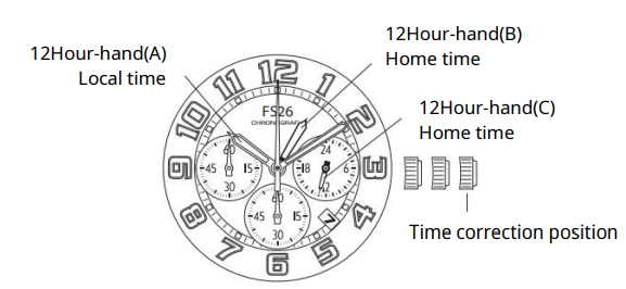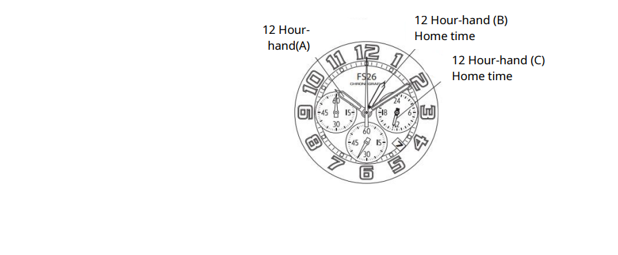 Using the hand (B) and 24 hand (C) for the “home time”. In other words, using the hour hand and minute hand to see the “local time”, while the 12 hand (B) and 24 hand (C) to see the “home time”. (When you use it domestically, the 12 hand (B) will be hidden under the normal hour hand.)