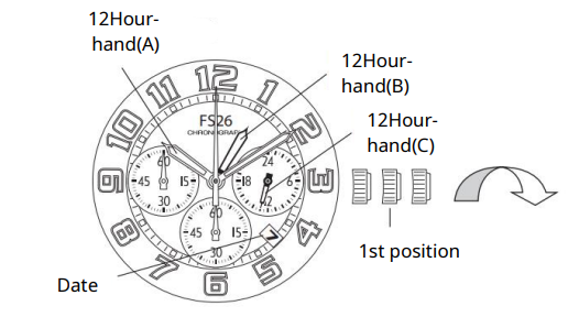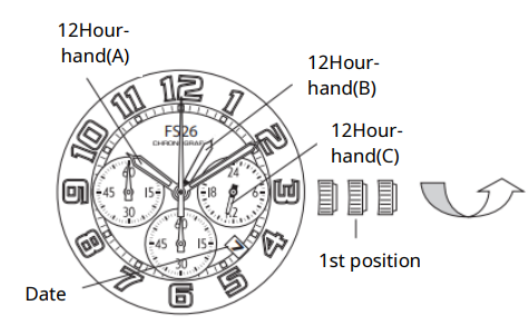 - Return the crown to the normal position. Setting the 12 hand (B) and 24 hand (C), and the minute hand has now been completed.