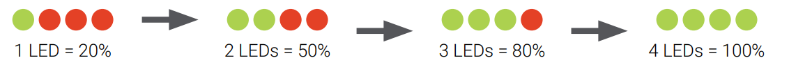 - Once fully-charged, all four green LEDs will illuminate without flashing