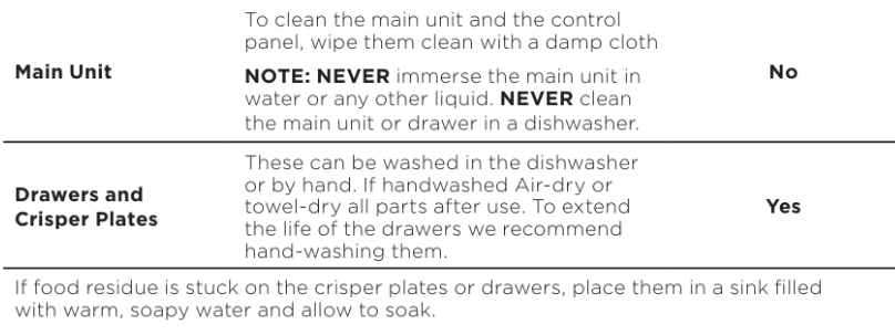 - The drawers and crisper plates are the ONLY dishwasher-safe parts.
