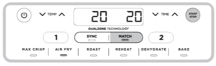 - Press the MATCH button to copy the zone 1 settings to zone 2. Then Press START/STOP to begin cooking in both zones.