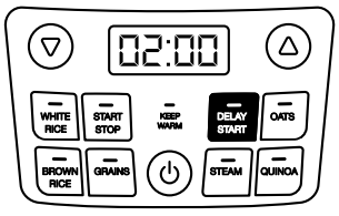 - If you press Delay Start, a default time (2:00) is displayed on the timer, indicating 2 hours until cooking or steaming starts. To adjust the Delay Start time, press the up/down arrows.
