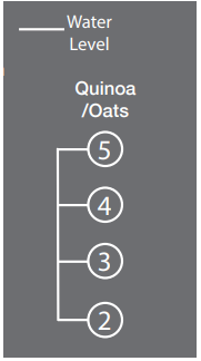 - On the inside of the EveryGrain™ Cooking Pot, some markings serve as a useful cooking guide, indicating how much water to put in the pot for the grain type and number of scoops you’re cooking.