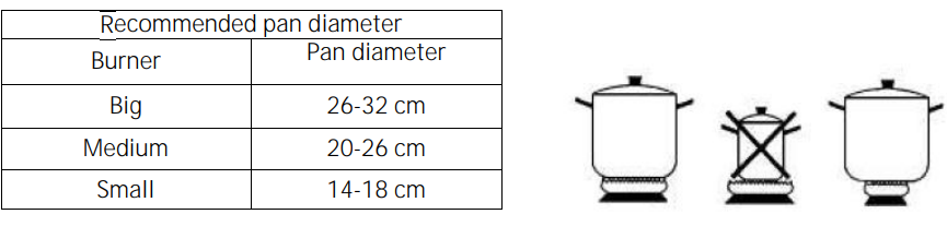 The most appropriate cooking point must be used according to the diameter of the pan. The flame must not