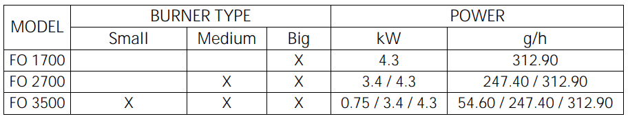 - FO 1700: 1 big burner; FO 2700: 2 burners, big and medium; FO 350: 3 burners, big, medium, and small.