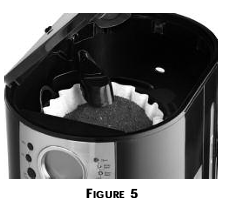 - Place a 10-12 cup paper basket-style filter or a permanent filter into the removable filter basket (Figure 5).