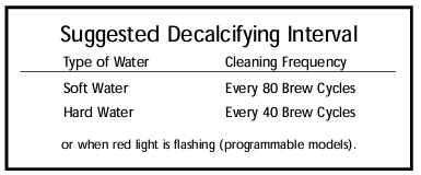 Minerals (calcium/limestone) found in water will leave deposits in your coffeemaker and affect its performance. It’s recommended that you regularly remove these deposits using white household vinegar.