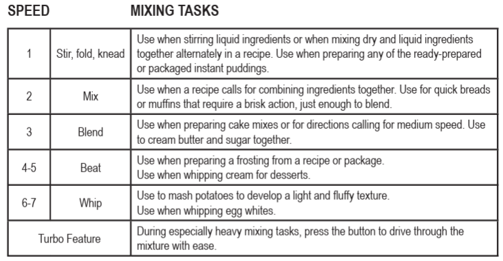 Before using your mixer for the first time, wash the beaters in hot/soapy water, or the dishwasher. Rinse and dry. Be sure speed control is in the “OFF” or “0” position and unplugged from an electrical outlet.