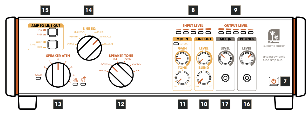 - Microphone/line input (can be mixed with the speaker simulator): Combine your favourite miked speaker with the Palmer PSUPSOAK Supreme Analogue Dynamic Tube for an analogue sound experience that‘s in a class of its own.