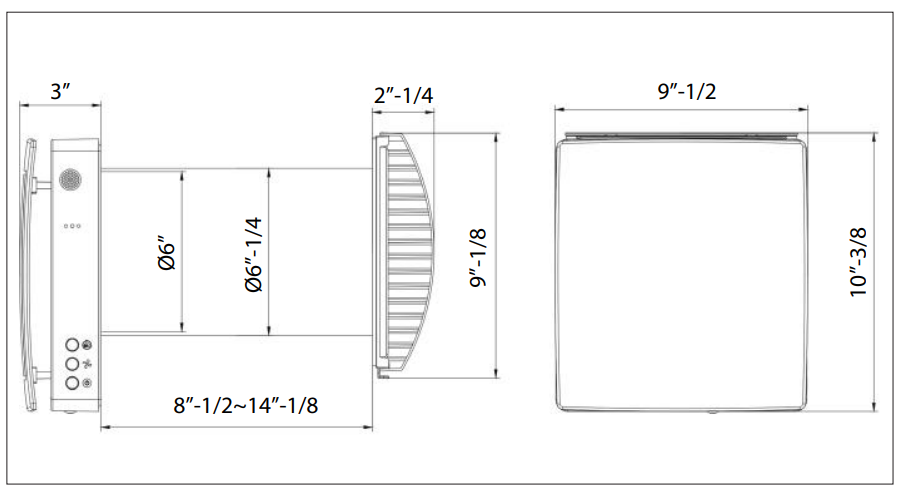 - The telescopic design of the fans allows for installation in walls ranging from 215 mm (8”-1/2) to 360mm (14”-1/8) thick.