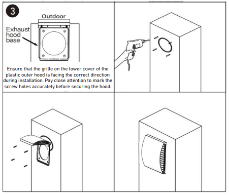 On the outside of the wall, mark the positions for the four screw holes on the base of the exhaust hood. - Drill the holes, then secure the bottom of the plastic hood using appropriate hardware.