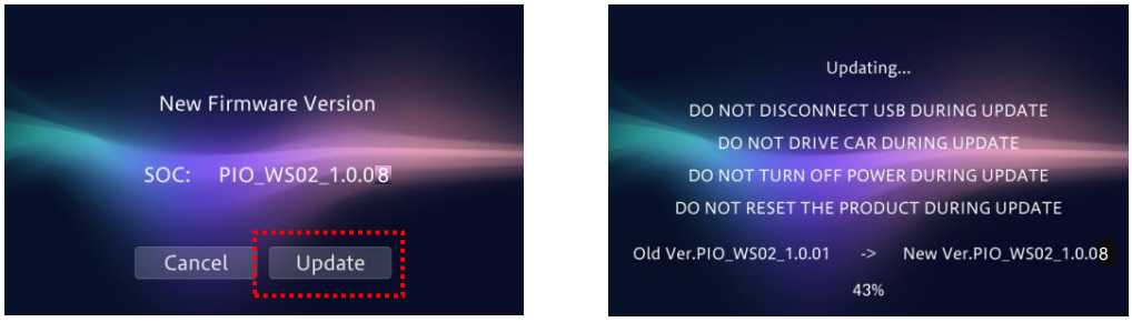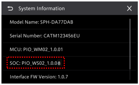 10. Check the firmware version as described in Pioneer SPH-DA77DAB System Firmware Update Step A “Displaying the firmware version” to confirm that the update was successful; the SOC firmware should be updated to version “PIO_WS02_1.0.08”