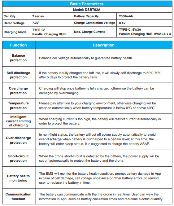 When receiving a new drone battery, it is required to charge it to wake it use the drone won’t start. Connect the TYPE-C charging port of the battery and a USB charger to the AC power supply to finish a one-time charging (USB charger is not included in the package). The user can use the charger that conforms to FCC/specifications to charge the battery. The red indicator will stay on during charging and turn off automatically after charging is done. Users can charge the battery with the Parallel Charging HUB if a fly expansion kit is purchased. For more details, please refer to the User’s Manual of Parallel Charging HUB. The Parallel Charging HUB can also charge the remote controller.