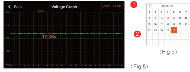 - After selecting a date, a graph will be displayed. Touching the screen will display the exact voltage and time at that point. Slide your finger across the graph to find precise points.