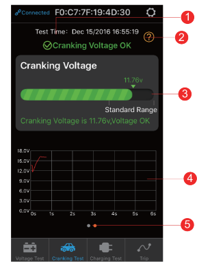 - Cranking voltage graph. Displays cranking voltage over time taken to start the engine.