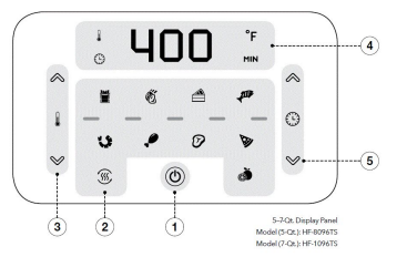 - Temperature Control Buttons: The + and − symbols enable you to increase or decrease cooking temperature 5° F at a time. Keeping a button PowerXL POWERXLHF 2096TS Vortex Air Fryer held down will rapidly change the temperature.