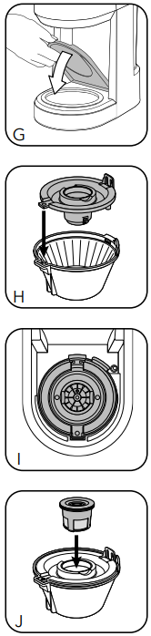 • Close the Reusable Filter’s lid and place the Reusable Single-Serve Ground Coffee Filter into the Pod Adapter. (J).