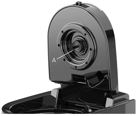 7. Check the brewing needle (A) for buildup before each use. If the brewing needle is clogged, use a needle, paper clip, or similar tool to remove excessive buildup from the hole in the brewing needle.
