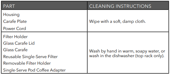 5. Wipe the outside of the appliance, power cord, and Carafe Plate, and the inside of the Filter Basket’s lid with a soft, damp cloth.