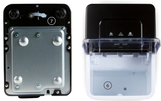 - Clean the ice basket, water reservoir, water tray, cooling fingers, and ice scoop regularly. Use a damp cloth with some mild detergent if necessary, to clean the inside and outside of the appliance. Rinse thoroughly before using the appliance again.