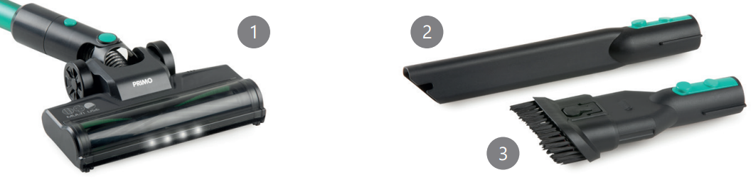 - Floor attachment with rotating floor brush: suitable for floors and carpets.