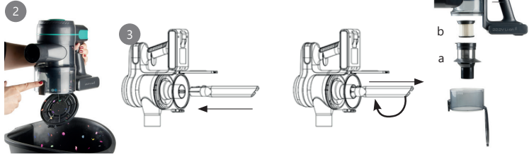- Remove the coarse filter (a) from the dust container by turning it clockwise.