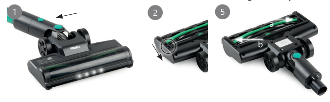 - To switch between the brush and the crevice tool, press the button to unlock the brush and slide it up or down.