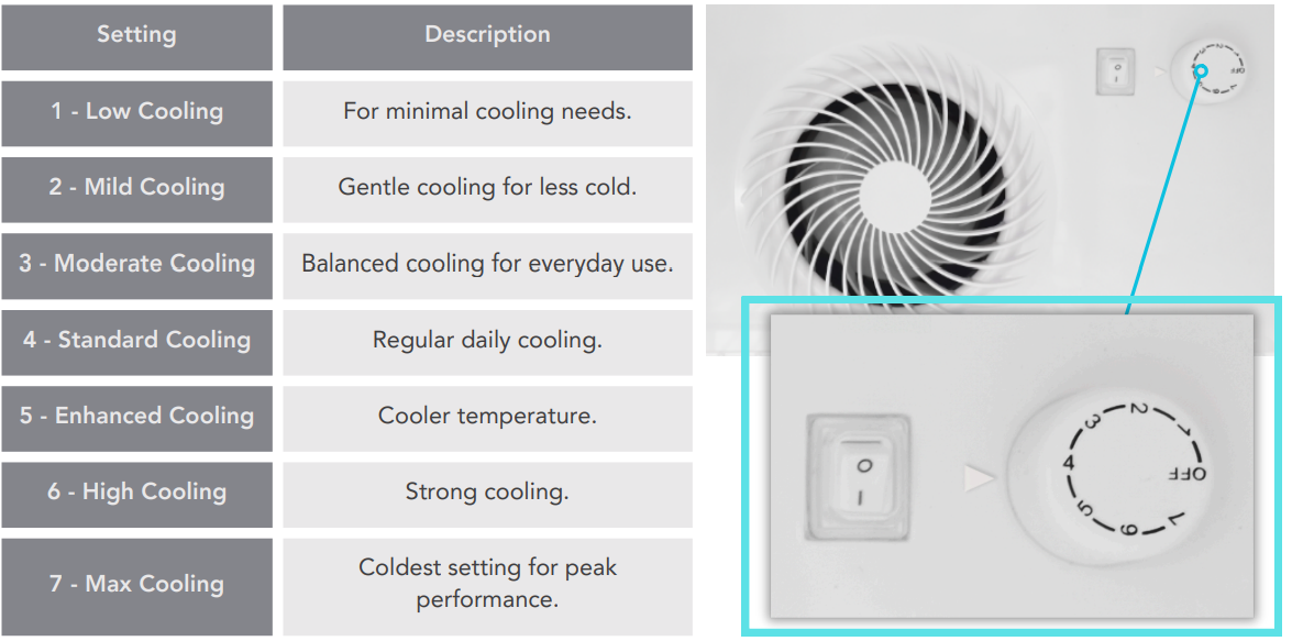 • The markings ‘1 – 7’ and ‘OFF’ on the control knob indicate the different temperature settings, with ‘1’ representing the warmest (50°F) and ‘7’ the coldest (32°F). It’s important to note that even when set to ‘7’, the temperature will not drop below freezing.