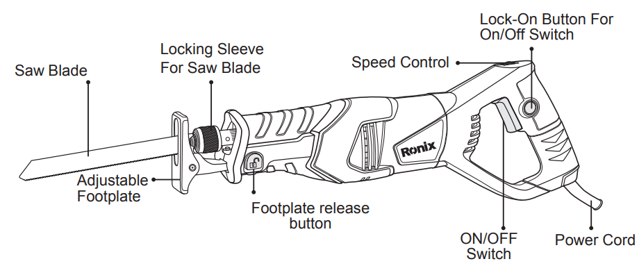 - To start the machine, press the ON/OFF switch Ronix 4221 705W Electric Reciprocating Saw and keep it pressed. To lock the pressed ON/OFF switch, press the lock-on button.