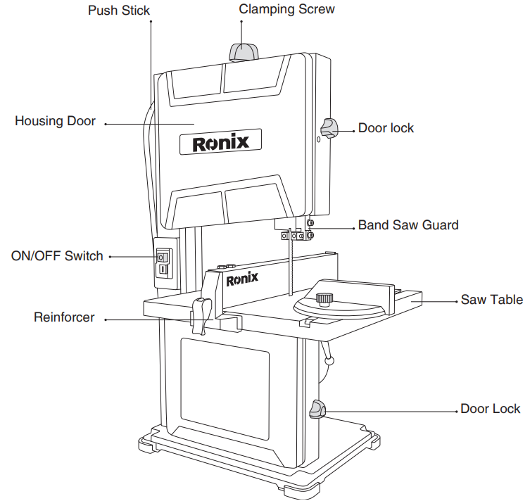 If you have difficulty mounting the band saw blade, call a qualified person. Only use Ronix saw blades that, suitable for your band saw. Open both housing doors. Remove one screw of the reinforcer and loosen the second screw. Lower the band saw guard all the way down.