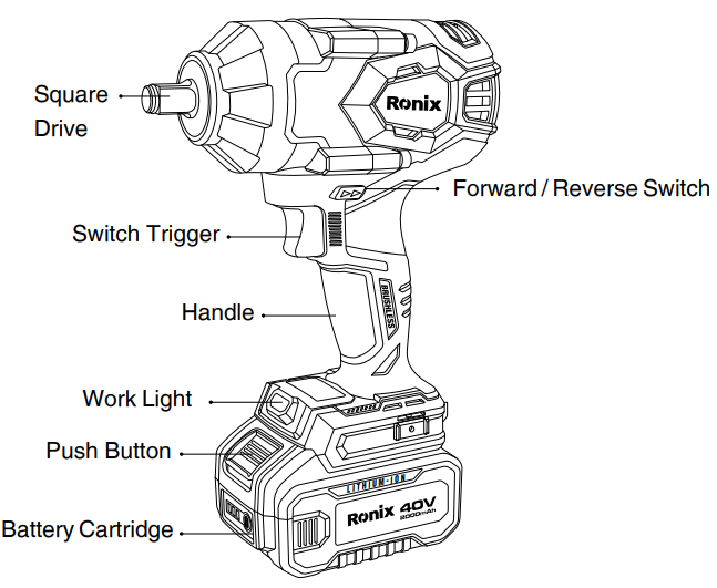 - To vary the driving speed, increase or decrease the Ronix 8907 40V Brushless Impact Wrench pressure on the trigger.