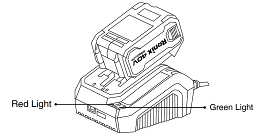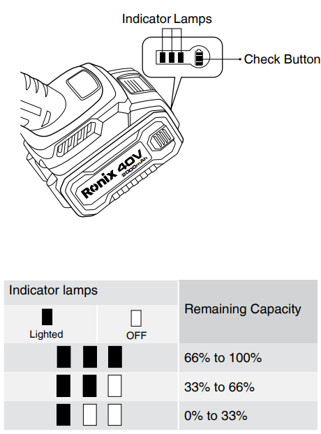 Charger Operating Mode Red Light Green Light Standby Mode ON OFF Charging Mode OFF Flashing 1Hz Charging Ending Mode OFF ON Preparatory Charging Mode OFF Flashing 1Hz Battery Failure Flashing 2Hz OFF Over Temperature Fault Flashing 1Hz OFF - Press the check button on the battery cartridge to indicate the remaining battery capacity. The indicator lamps light up for a few seconds.