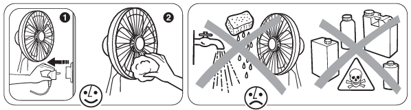 Before cleaning, unplug the fan. After removing the front grille, use a soft, moist towel to carefully wipe the blades. Clear the base and grille to avoid dust buildup.